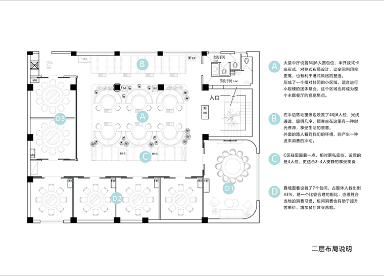 二樓布局以6人桌和包間為主,在內(nèi)地地區(qū)以式熟人關系為主人際關系,多包間隔離式就餐環(huán)境,能有效避免不必要人際的羈絆,從而使食客更放松安心就餐。