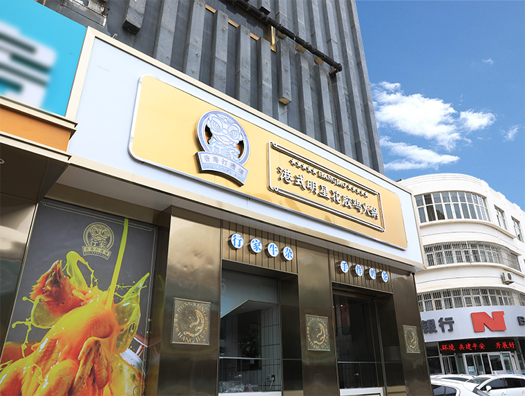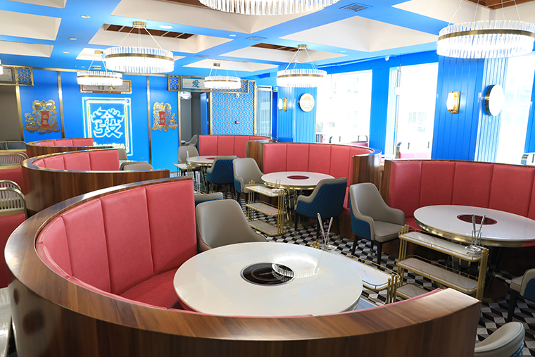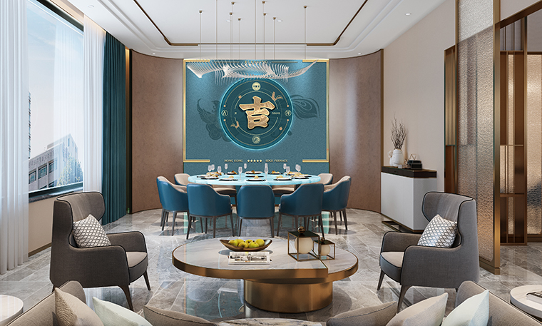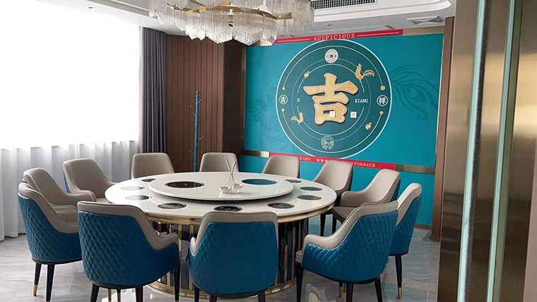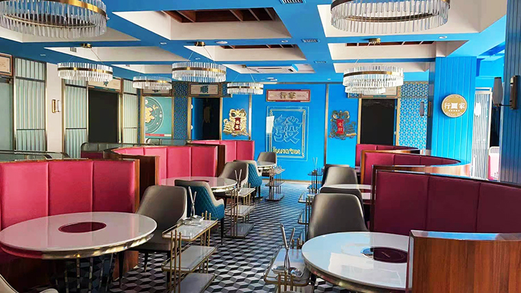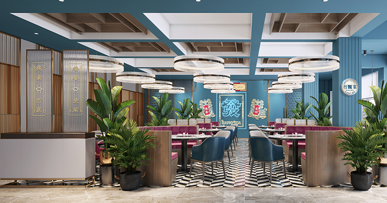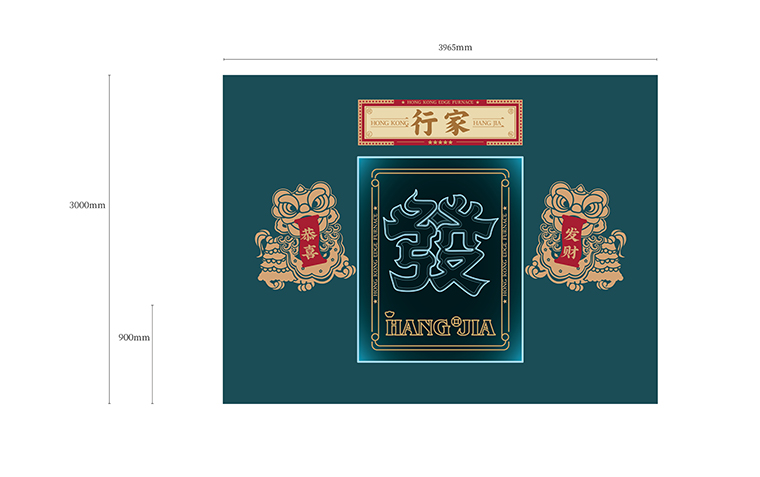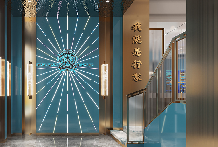 行家花膠雞港式打邊爐餐廳在顏色設計上結合品牌色,大面積使用不銹鋼金色,藍綠色,暗紅色,將餐廳打造成主題風格截然不同的港式餐廳,同時融入具有地域風情的港式風味,在文化元素上植入恭喜發(fā)財,順、發(fā)、喜等傳統(tǒng)香港吉祥話語元素,傳統(tǒng)與現(xiàn)代的元素融合在餐飲空間中,突破了人們對傳統(tǒng)港式餐廳的認知,重新定義新派港式打邊爐餐廳的基調。