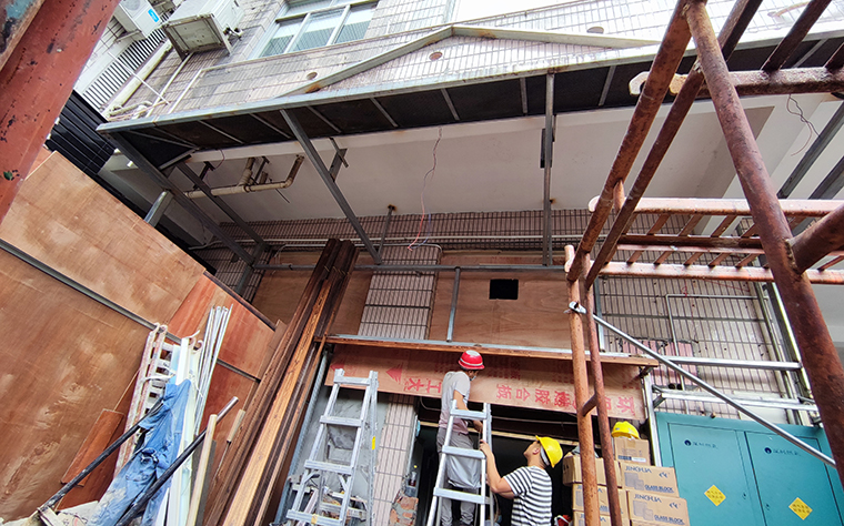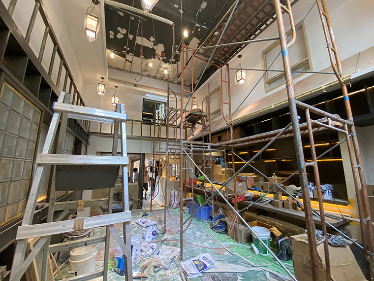 玉椿燒鳥居酒屋首店位于深圳的餐飲網紅高地——車公廟十畝地正對面。門店之前是一家中餐的后廚的全部空間及部分包間,其中一半的面積屬于上一家餐廳自己搭建的二層。空間結構非常復雜,地面高地不平,尤其是搭建部分的1層,2層實際高度不到2.5米,心理感受很逼窄,這個場地極為考驗品深項目團隊中空間設計師的功力水平。