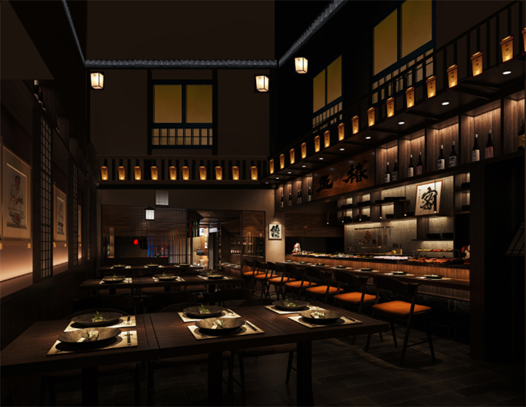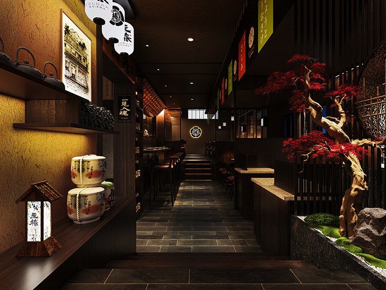 工作內容:日本料理燒鳥居酒屋餐廳平面布局設計,日本料理空間裝飾效果圖設計,燒鳥居酒屋空間施工圖設計,居酒屋空間軟裝陳列設計,品牌文化植入空間策劃設計