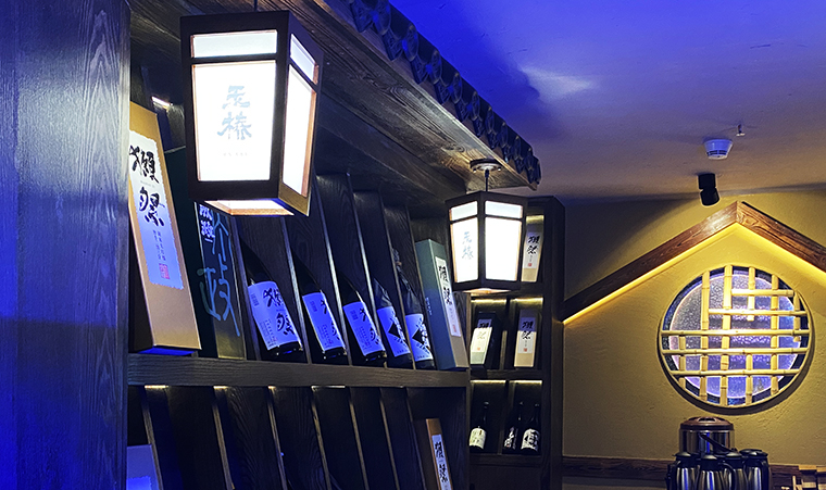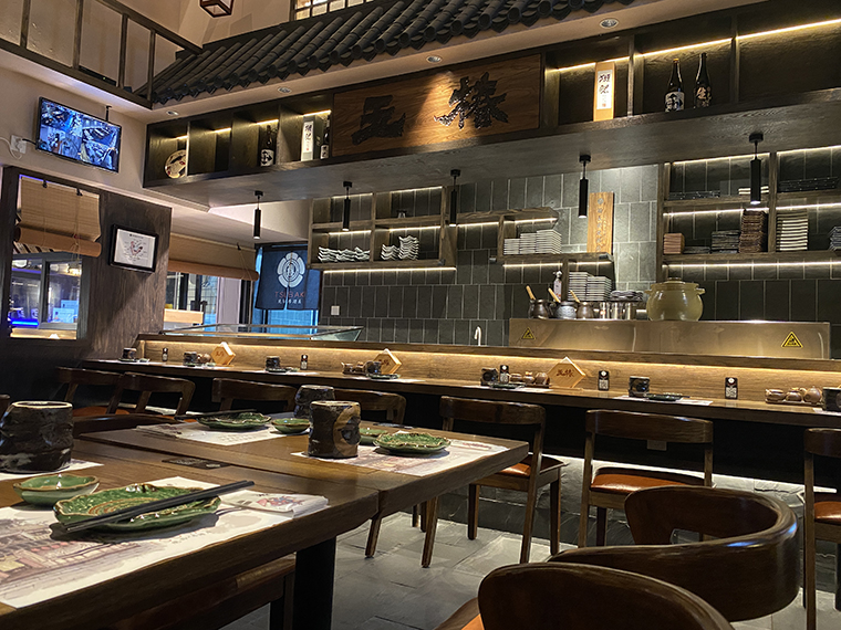 在本項目中,我們在顧客進餐廳大門的右手邊設置了水吧,收銀臺。居酒屋的酒水尤其是生啤非常好銷,水吧具備酒水制作的操作功能、收納功能及門口忙碌時的接待功能。功能如此繁多,品深餐飲的空間設計師需要把每個設備的尺寸都考慮到,尺寸偏差不能超過2厘米。收銀臺的功能反而要弱化,因為流行掃碼點餐,即時結算,顧客不再簇擁到收銀臺來結賬了。