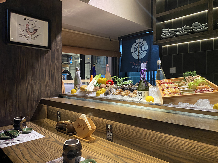 最能體現居酒屋熱鬧感的是大廳,最能感受燒鳥店煙火氣的是燒烤臺前的長吧臺。當我們坐在燒鳥長吧臺前,看著燒鳥師傅熟練地穿串,精準地控制火候,不時地翻動烤串,美味現場呈現,匠傳玉椿的理念就鮮明直觀地傳達出來了。所以,整個大廳都是圍繞著燒烤吧臺這一焦點而展開的,全部為單人椅及兩人座位,位置靈活組合,利用率非常高。