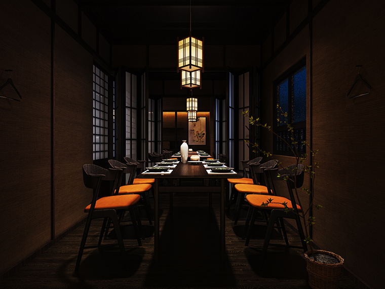 我們從門頭開始到天花吊頂、地面鋪設、墻面涂料、燈光、家具等各方面圍繞“京都味道、匠傳玉椿”來展開步移景異,一步一景的空間效果圖設計。
